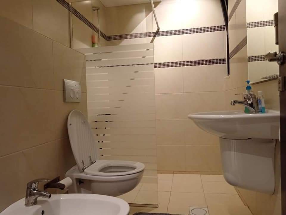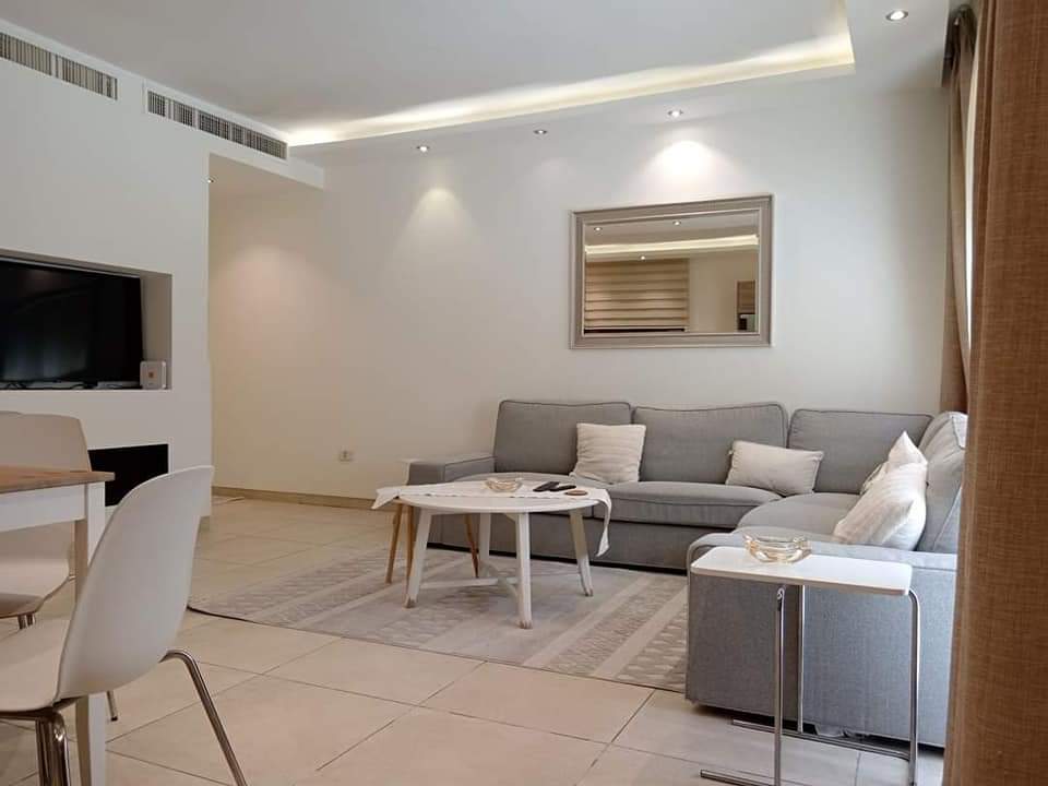 أم أذينة، شقة أرضية مفروشة بالكامل للإيجار، مساحة 100م2 + تراس أمامي، مدخل خاص، 2 غرف نوم (1 ماستر)، 2 حمام، تكييف مركزي.